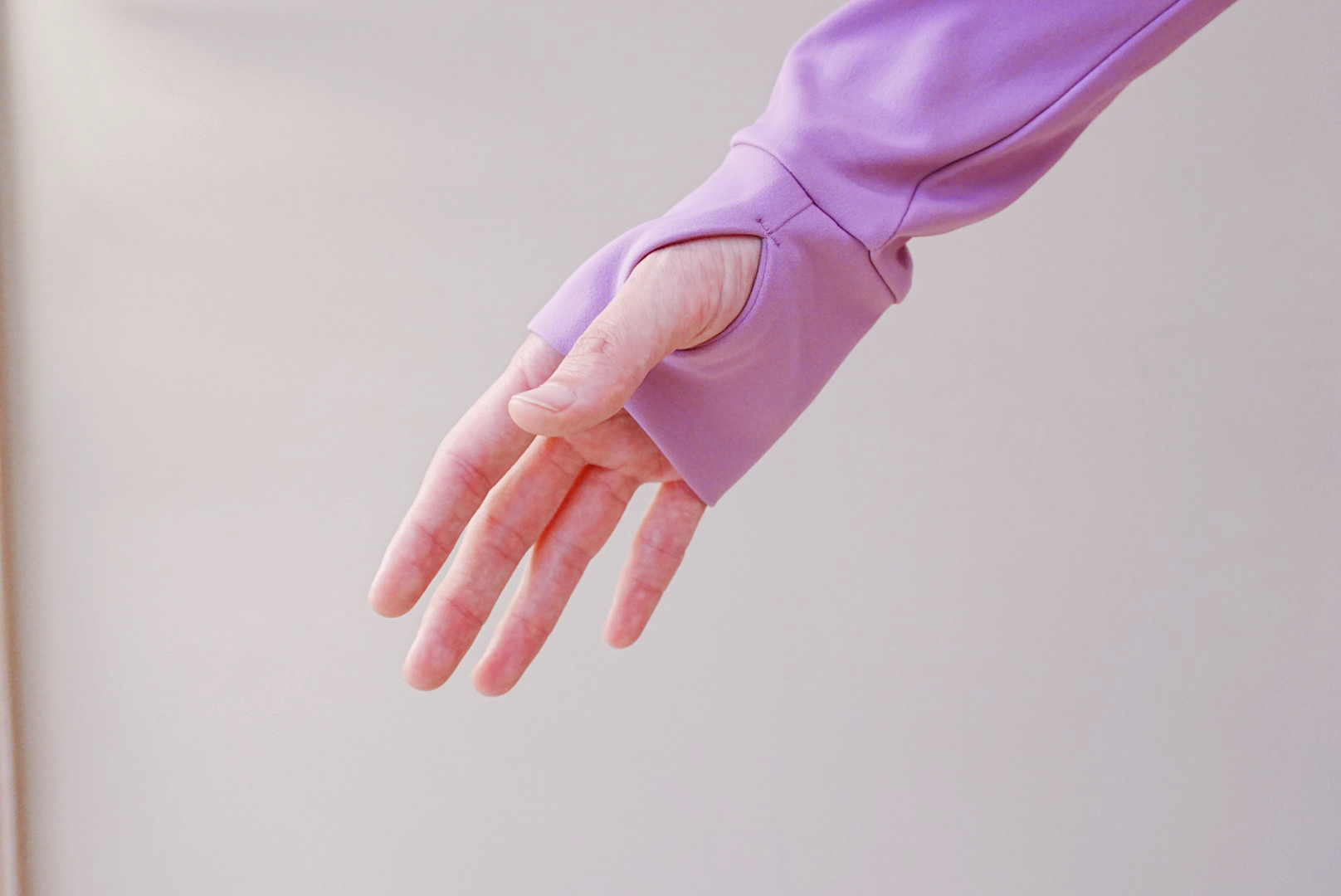 袖子调整到刚刚好的长度,不用担心手臂一举衣服跟着跑、套指的地方卡手痛